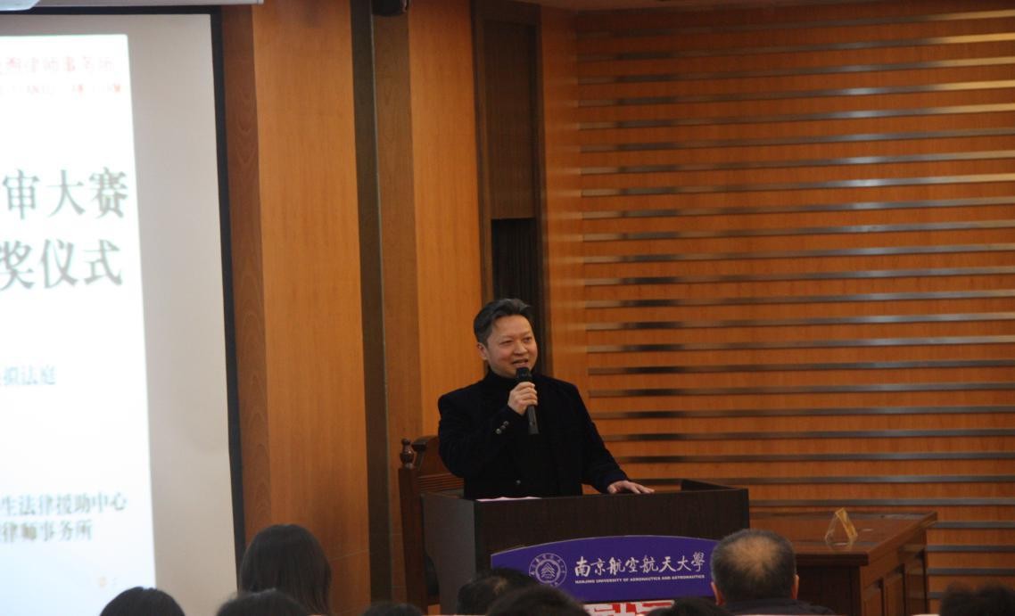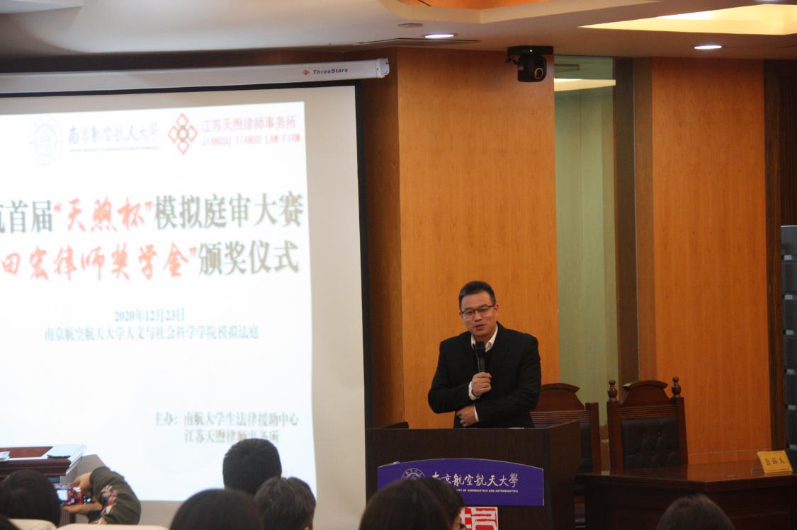 12 月 23 日下午,南航首届“天煦杯”模拟庭审大赛暨“田宏律师奖学金”颁奖仪式于模拟法庭隆重举行。本次活动由我院主办,校大学生法律援助中心承办,江苏天煦律师事务所参与协办。江苏天煦律师事务所主任田宏等,校党委宣传部、学生处、研究生院、校团委及我院部分领导、老师出席比赛。18 级法学本科生、20 级法律硕士研究生代表参加模拟庭审比赛决赛,全校部分师生到场观看比赛。