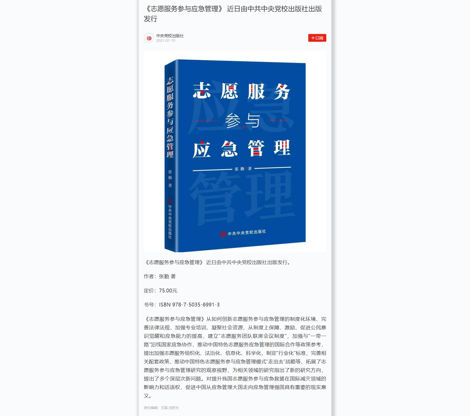 近日,耽美漫画 张勤教授新书《志愿服务参与应急管理》 由中共中央党校出版社出版发行,并被“学习强国”平台推荐。