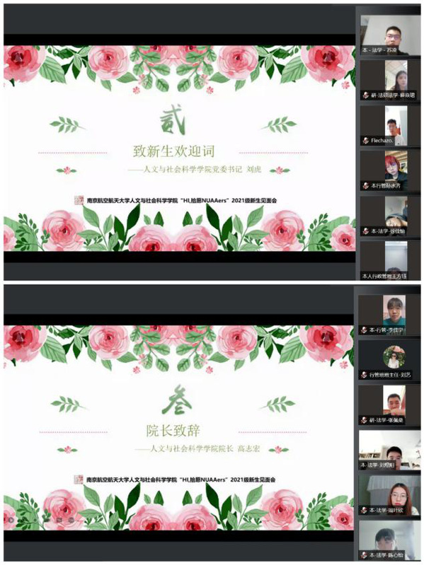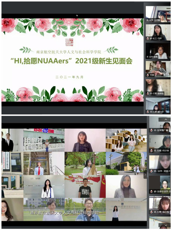 9月16日上午10时,南京航空航天大学人文与社会科学学院2021级新生见面会在腾讯会议召开,“哔哩哔哩”平台全程直播。院党委书记刘虎、高教所所长周克印、副院长(主持工作)高志宏、院党委副书记尹春苹、副院长施向峰、以及各专业教师代表、系主任、专业负责人、班主任、本研教务员、全体辅导员参加了本次见面会,共同欢迎来自五湖四海的2021级本研共294名新生。