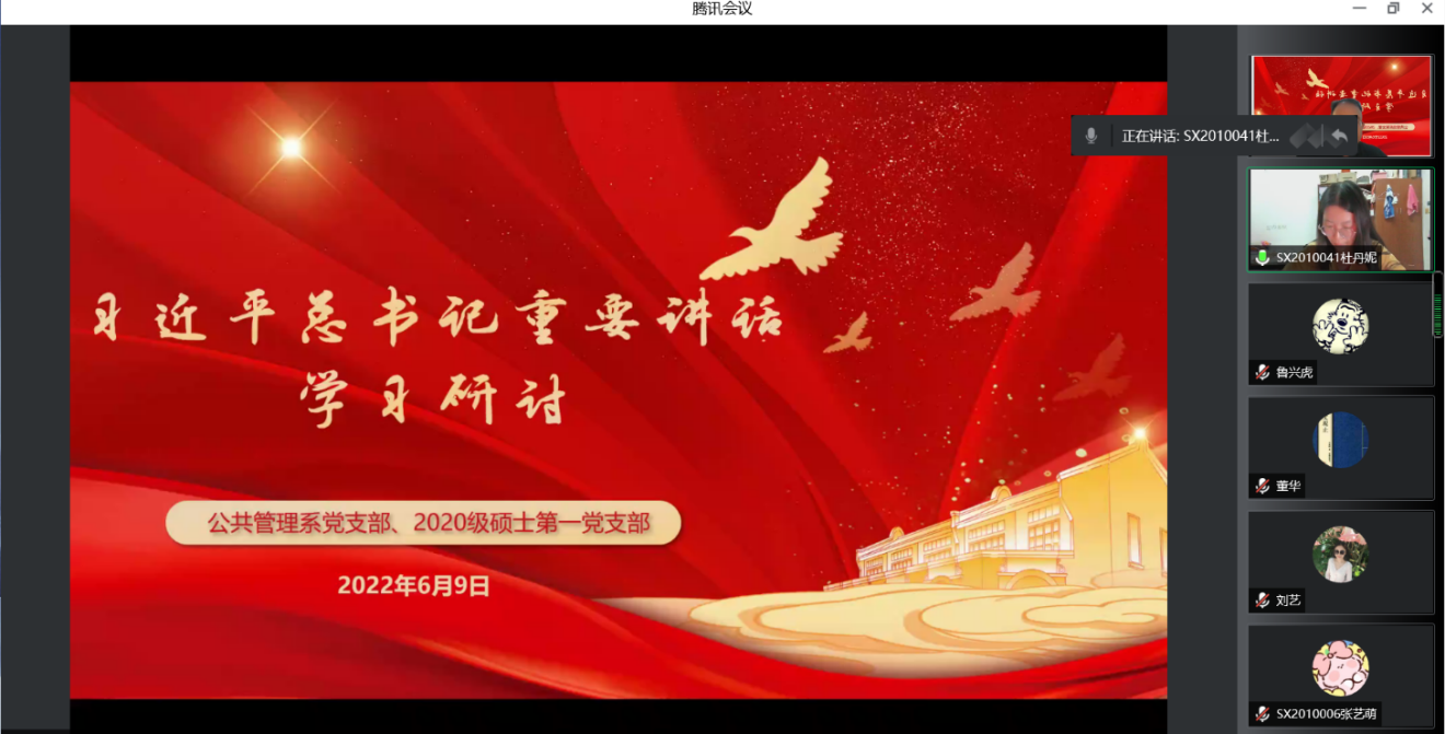 6月9日晚,耽美漫画 公共管理系教工党支部与学生2020级硕士第一党支部开展联合学习,专题学习了习近平总书记近期重要讲话精神。公共管理系党支部全体党员,2020级硕士第一党支部全体党员、发展对象、积极分子参加了会议。会议由公共管理系党支部书记许汉泽主持。
