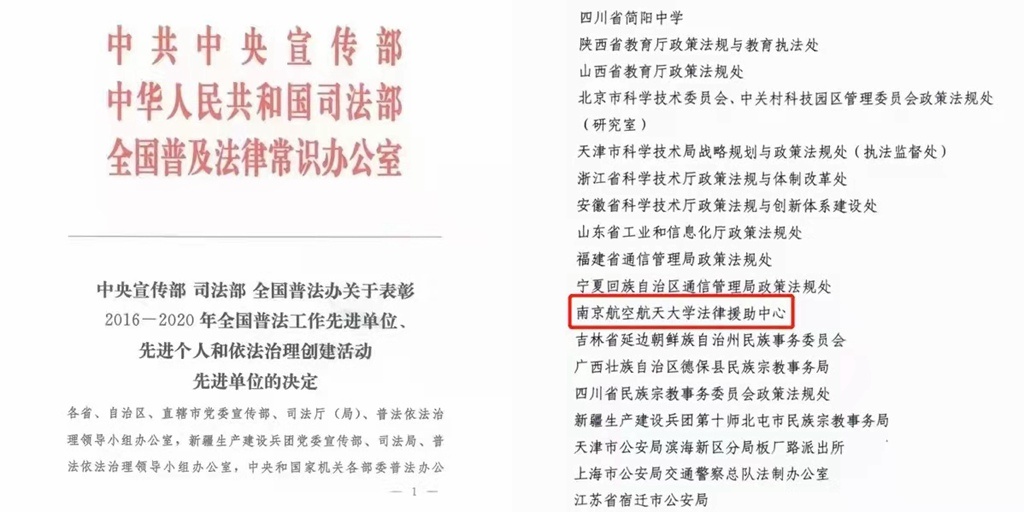 近日,中央宣传部、司法部、全国普法宣传办印发《关于表彰2016-2020年全国普法工作先进单位的决定》,南航法律援助中心获评“全国普法工作先进单位”。全国仅三家高校获此殊荣。
