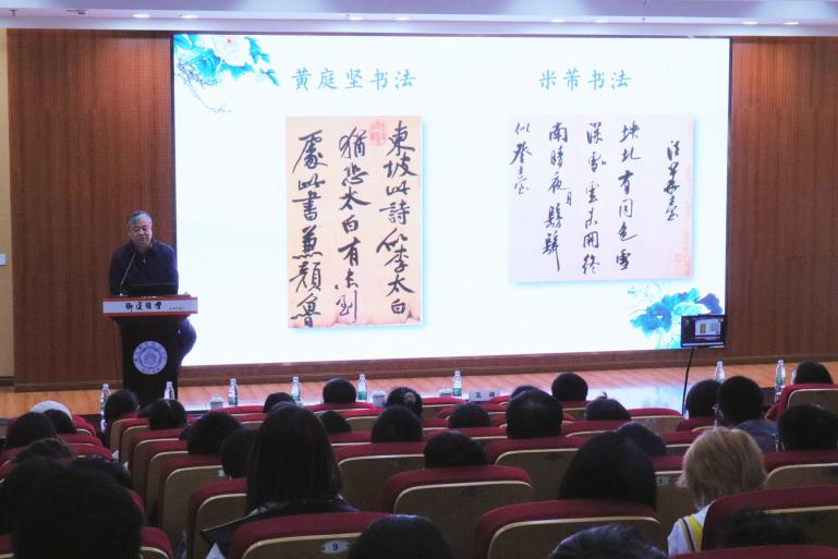 讲座中,高峰以现场师生熟知的《长恨歌》为引,从书法、绘画、茶酒文化、生活特色和诗词气质等角度,对唐宋文人精神气质的差异作了进一步分析。在比较唐宋文化的差异时,高峰援引了众多图片资料和诗词例证,旁征博引,显示出深厚的文学素养和渊博的知识储备。最后,高峰声情并茂地吟诵了唐诗宋词代表作,引得全场掌声不断。