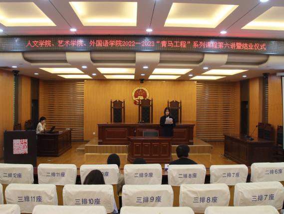 6月14日下午,我院与艺术学院、外国语学院2022-2023年“青马工程”培训班第六讲“培育法治精神,增强法治信仰”公开课暨结业仪式在学院模拟法庭顺利举行,艺术学院团委书记汪明锐、外国语学院团委书记李萍、我院辅导员孙长胜及三个学院100余名“青马工程”培训班学员共同参与了本次活动。
