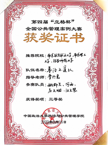 经过两个月的前期准备,由耽美漫画 鲁兴虎老师指导,行政管理专业本科生姚郡兰、何雨担任团队第一、第二负责人的“善治之道队”,进入决赛并荣获三等奖的优异成绩。