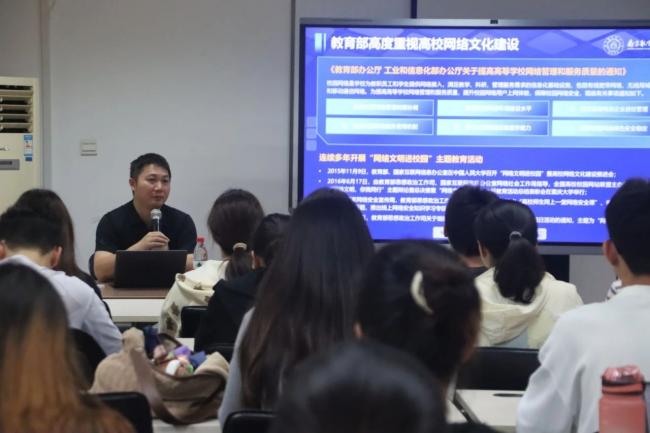 为弘扬诚信互助的网络风尚,提升同学们的网络文明素养,5月31日上午,我院在210教室召开开展以“践行社会风尚,共筑清朗网络空间”为主题的第十期“红心领航”思享会,以“践行社会风尚,共筑清朗网络空间”为主题,邀请学校信息化处副处长谢健开展专题分享。