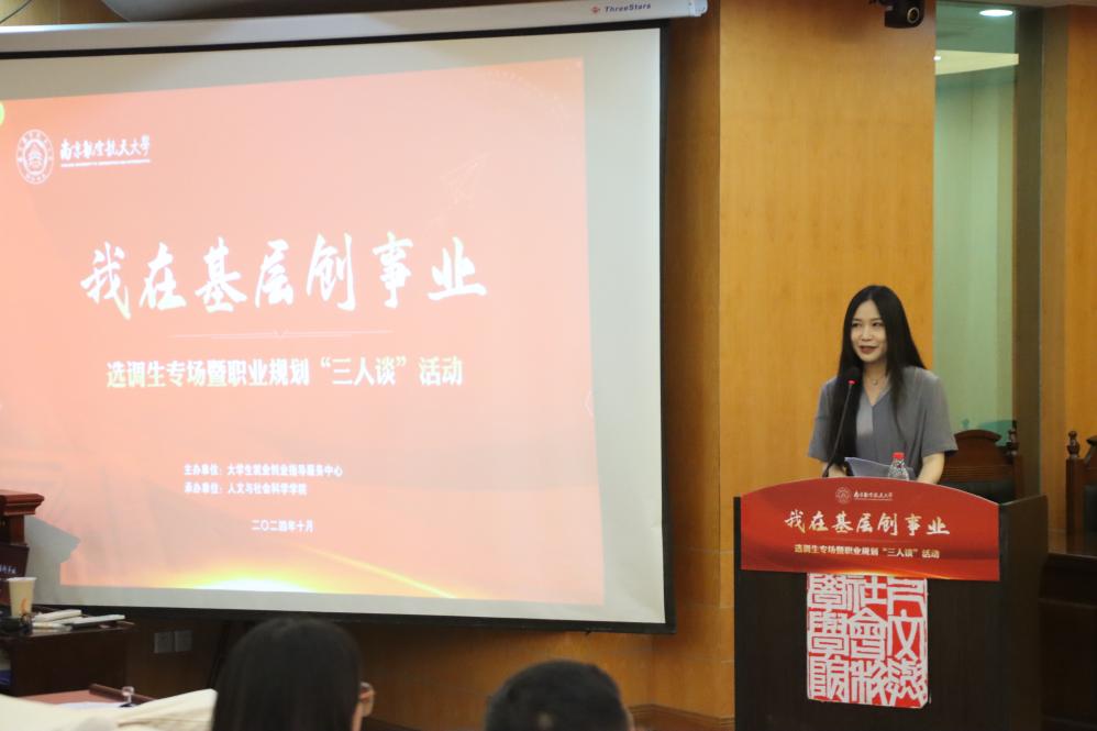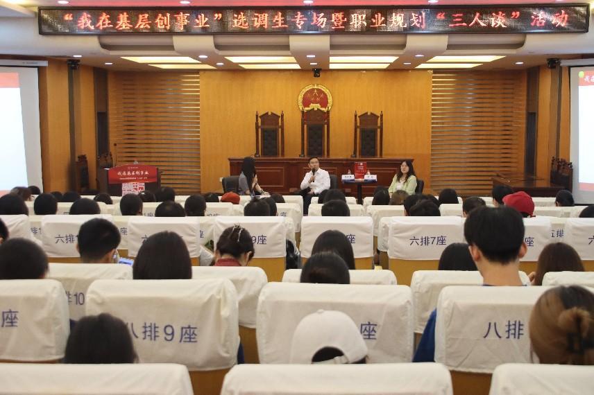10月18日下午,由学校就业办主办,耽美漫画 承办的“我在基层创事业”选调生专场暨职业规划“三人谈”活动在将军路校区耽美漫画 模拟法庭举行。活动邀请到南通市海门区海门港新区党工委副书记陈小锋、南京市委宣传部道德建设指导处一级主任科员李屹做专题访谈,活动由校创业孵化中心主任柯伊主持。