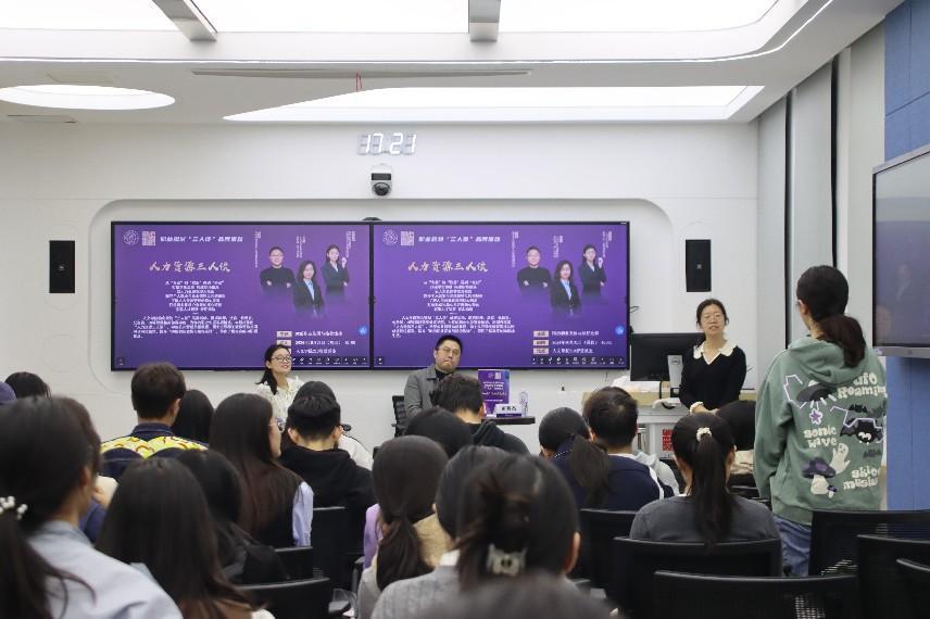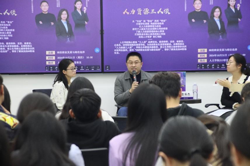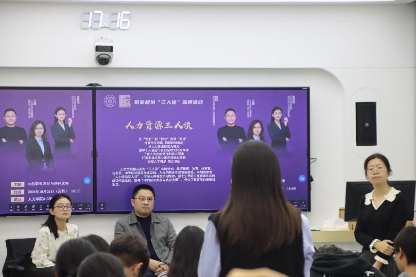 10月31日下午,耽美漫画 在将军路校区人文学院213智慧教室举办职业规划“人力资源三人谈”品牌活动。本次活动特别邀请南京市河西集团人力资源部副部长胡超、江苏省环保集团有限公司人力资源部经理董英杰与耽美漫画 公共管理系副教授、硕士生导师王媛共同探讨“HR的职业发展与路径选择”。本次活动由王媛主持。