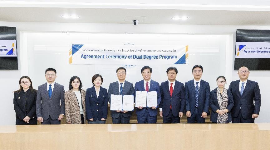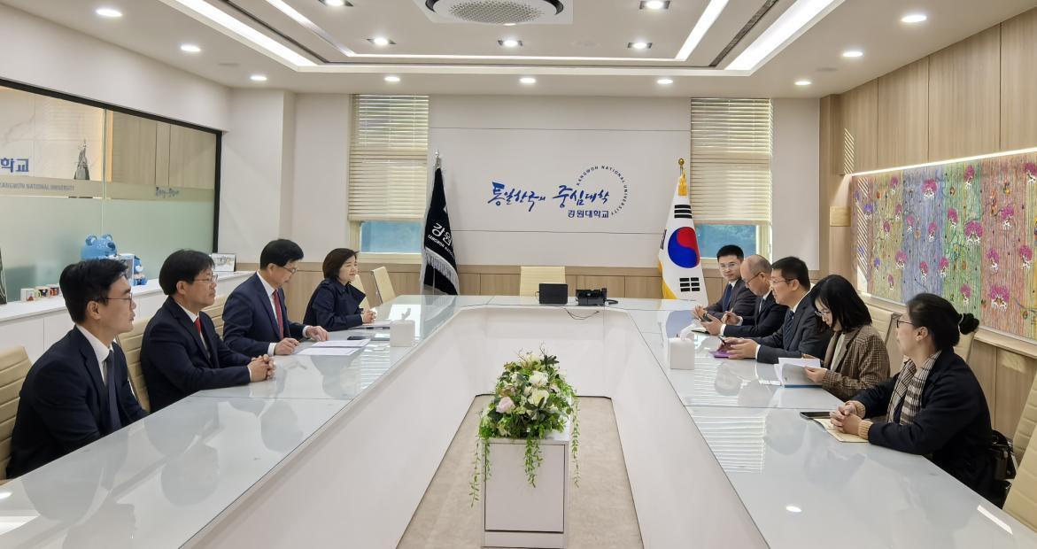 楚广兴一行首先访问了韩国国立江原大学,并与江原大学校长Jeong Jae-yeon教授,计划处处长、知识产权学院院长Jeong Jin-keun教授,国际合作交流处处长Kim Yeo-jin展开交流。双方分别介绍了江原大学和耽美漫画 的办学历史、基本情况,并就师生互访、合作研究、学术会议及双学位硕士合作等具体事宜达成共识。Jeong Jae-yeon代表江原大学与我校签订了硕士双学位项目合作协议书。