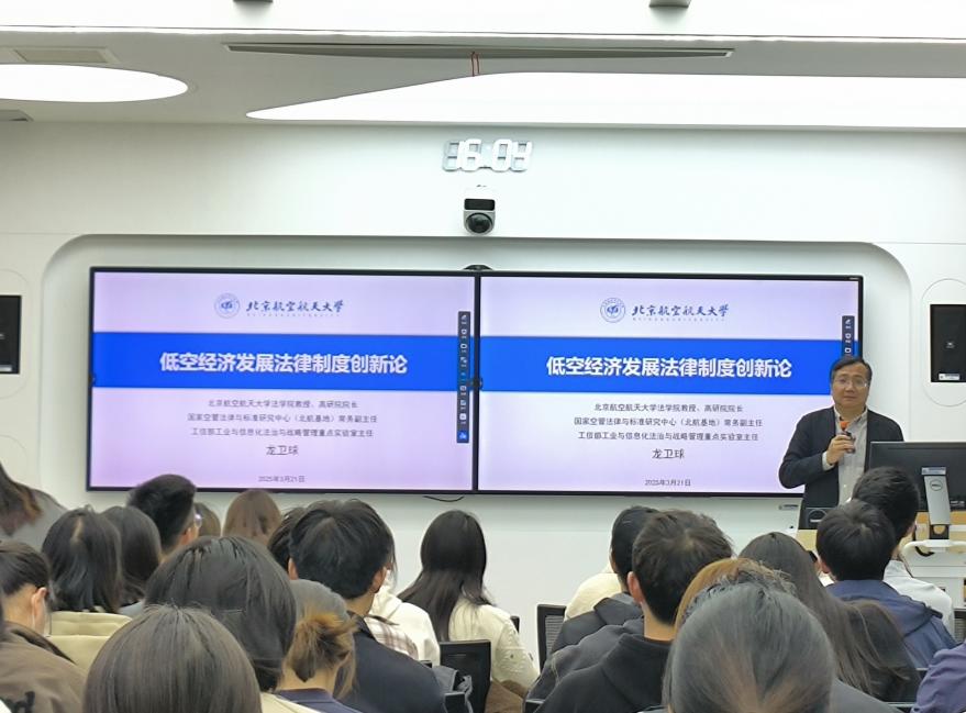 本次讲座,龙卫球教授聚焦低空经济发展特殊法治保障问题,针对当前低空经济发展的需求和障碍,探讨制度创新的基础和重点。在讲解过程中,龙卫球教授从“低空开放使用”“低空安全观革新”两方面出发阐述了当前低空经济发展的难点及革新方向。