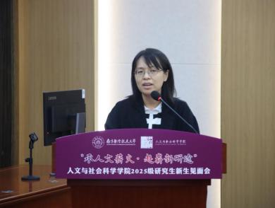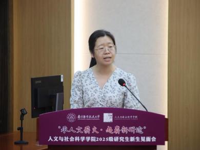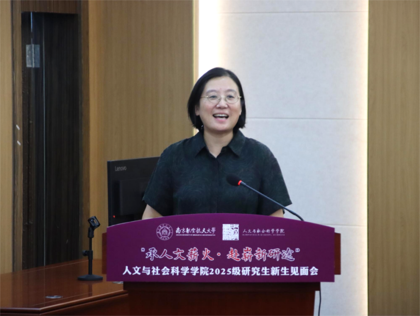 研工部副部长雷蕾向各位新同学的到来表示热烈欢迎。她强调,研究生阶段是知识深化、能力提升、思维碰撞的黄金时期,希望同学们能正确认识导学关系、同辈关系、小我与大我的关系,在青春奉献中彰显人生价值。她祝愿2025级新同学们在南航、在人文学院能不忘初心、坚守理想、收获成长。