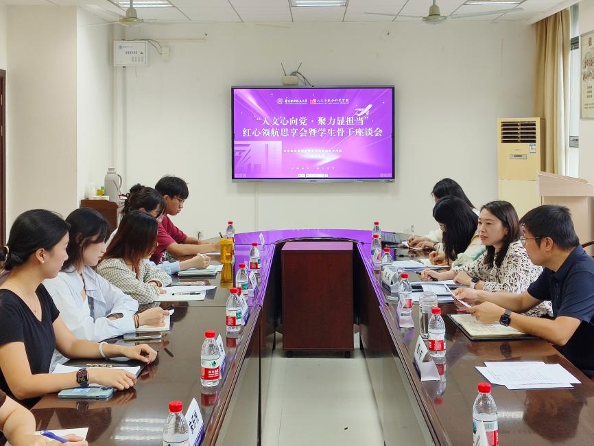 为进一步加强学生骨干队伍建设,切实提升学生工作质量与效能,为下半年学院党员大会召开凝聚青年力量,9月25日,我院在312会议室召开“人文心向党·聚力显担当”红心领航思享会暨学生骨干座谈会。院党委书记楚广兴、院党委副书记李丽,院团委书记、研究生辅导员施俞辛,本科生辅导员聂小芳以及本研学生骨干代表参加会议。会议由院党委副书记李丽主持。