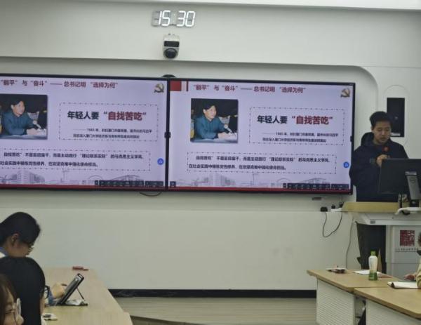 袁振涛以习近平总书记 “要勇于‘自找苦吃’”的寄语为主题,结合自身和支部成员的成长经历,表示党员同志要敢于走出舒适区,主动到艰苦的环境中去磨练意志、增长才干。顾盼盼基于《习近平的七年知青岁月》,讲解了习近平总书记“以人民为中心”思想的演变历程,鼓励党员同志要扎根中国大地,担当历史使命。