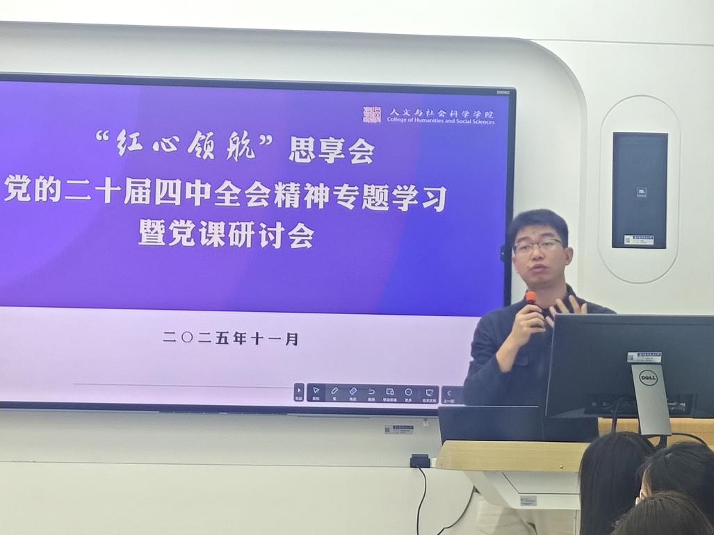 陈启超详细解读了此次全会审议通过的纲领性文件《中共中央关于制定国民经济和社会发展第十五个五年规划的建议》,从“对内”“对外”两个方面深刻剖析了中国未来各领域发展的战略部署与前进方向。他鼓励党员同志持续学原著、学理论,明确“十五五”时期国家发展重点,在个人发展道路上深耕专业、锤炼本领,为中国式现代化建设贡献青春力量。