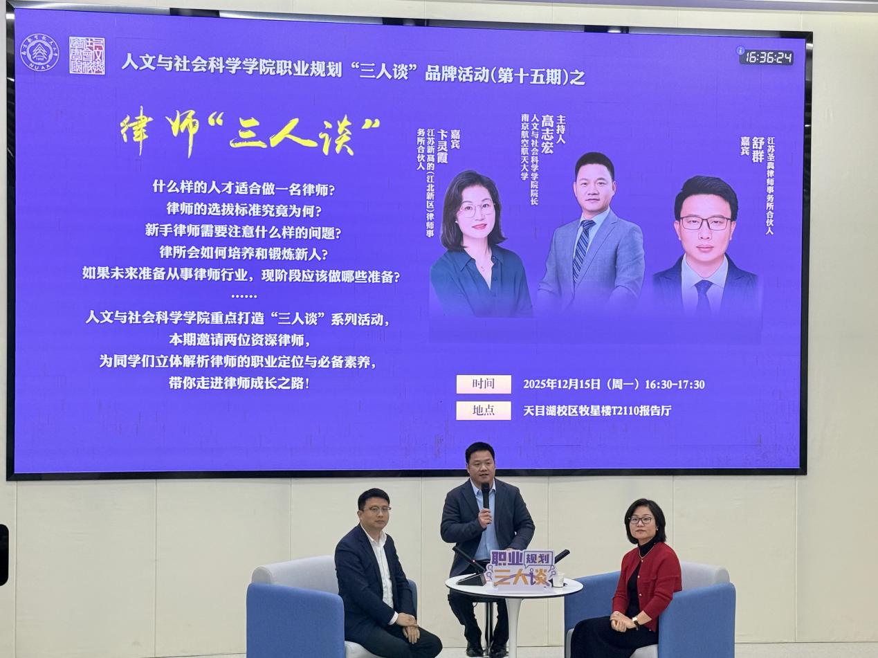 为帮助法学专业学生深入了解律师职业发展路径,明晰职业能力要求,12月15日下午,我院在天目湖校区成功举办职业规划“三人谈”品牌活动第十五期之“律师三人谈”分享活动。本次活动由院长高志宏主持,特邀江苏圣典律师事务所合伙人舒群律师、江苏新高的(江北新区)律师事务所合伙人卞灵霞律师作为分享嘉宾,围绕律师职业认知、专业能力塑造、行业发展趋势等主题展开深入交流。