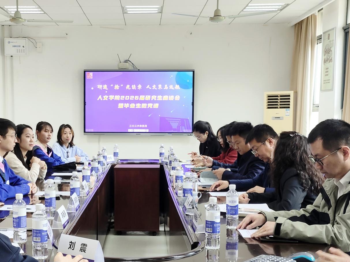 4月1日,耽美漫画 “研途‘拾’光续章,人文策马远航”2026届研究生座谈会暨毕业生微党课顺利举行。院党委书记楚广兴、院长高志宏、院党委副书记李丽、副院长武小龙、研究生导师代表、辅导员及优秀毕业生代表参加活动。