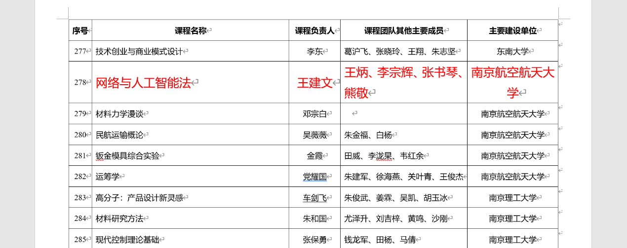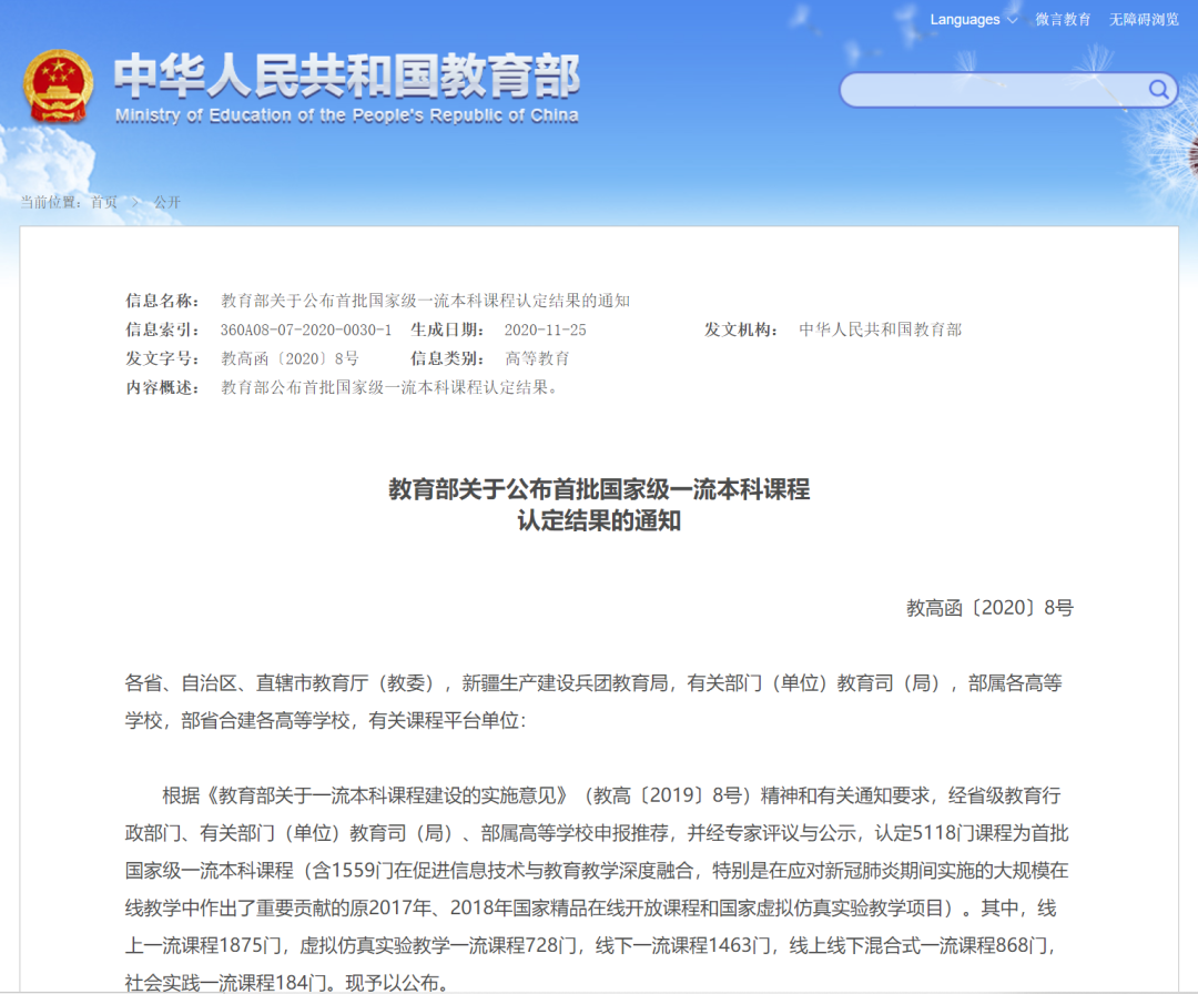 2020年11月30日,教育部官网发布《教育部关于公布首批国家级一流本科课程认定结果的通知》,我院《网络与人工智能法》课程入选“首批国家级一流本科课程”。