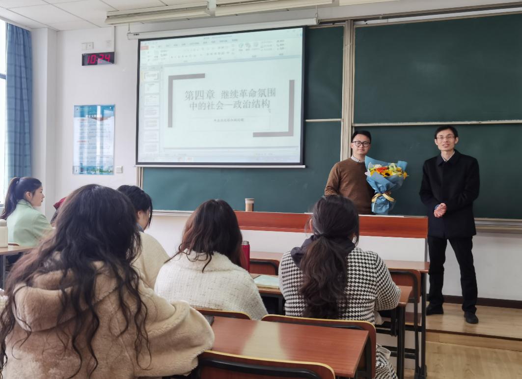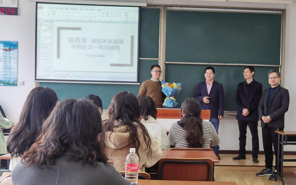 3月15日上午,人文与社会科学学院新教师“第一堂课”引荐仪式在将军路校区东区D3309教室举行,学院党委书记刘虎、院长王建文、副院长施向峰、公共管理系主任鲁兴虎老师参加了仪式,庆祝新教师田鹏老师第一次走上讲台。
