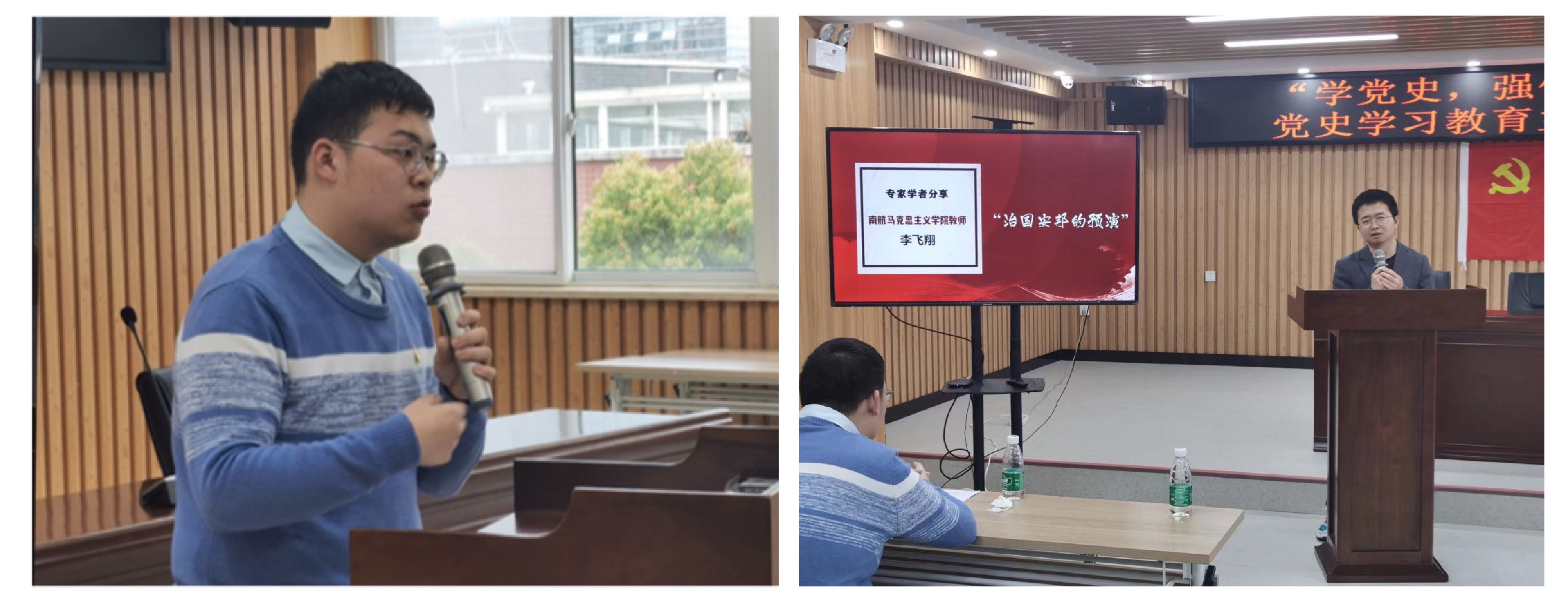活动在青年学子读党史,基层青年讲团史中展开。支部青年郭小凡同学从中华苏维埃共和国临时中央政府建设中的党史小故事讲起,带领大家深刻学习领悟了党保持优良作风、坚定人民立场的先进品质。雨花街道团工委书陈晨则深情地回顾了承载了几代共青团员火热青春的“共青团路”的历史沿革。随后马克思主义学院教师李飞翔从当时民主法制建设的智慧到现今疫情冲击下的基层治理模式深刻启迪,引发青年们深思。青年代表的讲述也激励着在座的每一位青年关心国家大事、关注社情民意,立足于自身的知识和技能,通过志愿活动、实习实践等方式,为‘小我融入大我’的实践矢志奋斗。