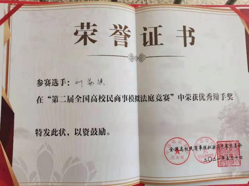 2021年5月7日——11日,南京航空航天大学人文与社会科学学院组成代表队赴北京参加第二届全国高校民商事模拟法庭竞赛。学院法律系郭莉老师担任指导教师,关佳宝、刘家祺、刘季龙、刘炎昊、许海雯、刘婕等同学参加了比赛。刘家祺同学在比赛中脱颖而出,获得“优秀辩手”称号。