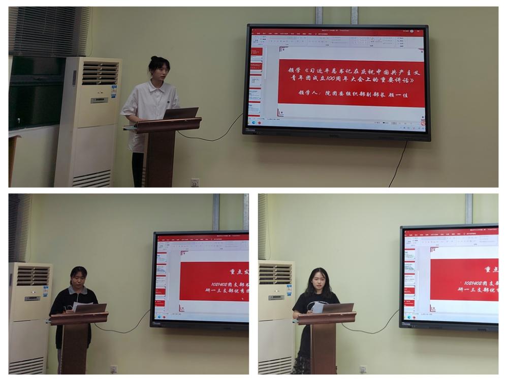 院团委组织部副部长顾一佳首先带领大家学习了习近平总书记在庆祝中国共产主义青年团成立100周年大会上的重要讲话精神,1021402团支部书记李佳宁、研一优秀团员代表邱天依次发言,分享了学习感悟。