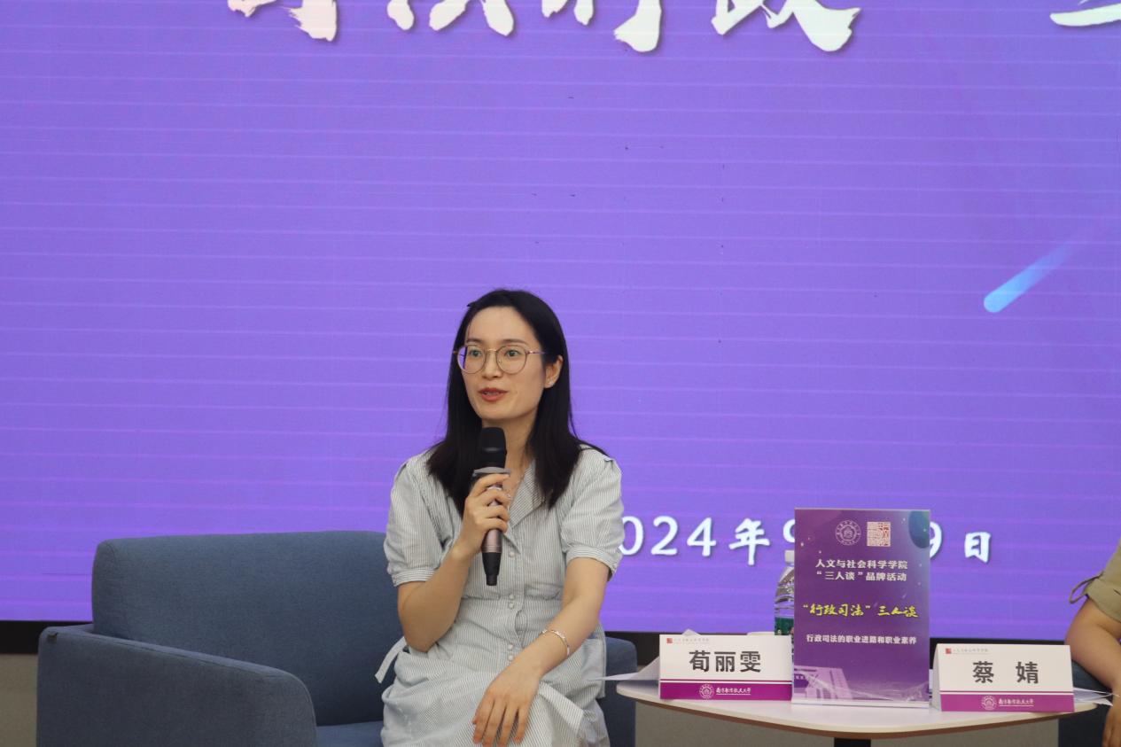 9月29日下午,我院在天目湖校区巡天楼二楼报告厅举行职业规划“司法行政三人谈”品牌活动。溧阳市司法局复议应诉科科长荀丽雯、溧阳市司法局政治处主任蔡靖作为嘉宾参加活动,活动由学院党委副书记刘思辰主持。