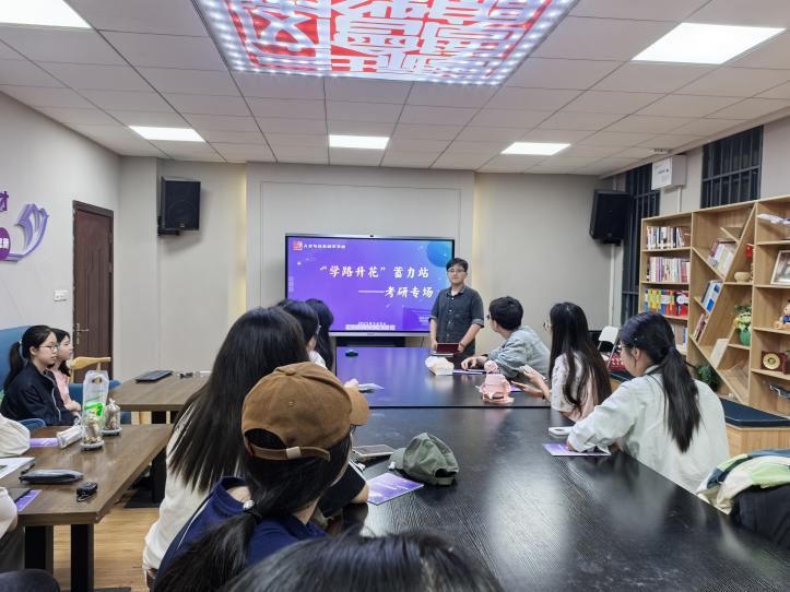 5月9日晚,“学路升花”蓄力站——考研专场主题沙龙在我院104教室开展。本次沙龙邀请了2021级本科生周映红、钱一骏两位同学作主讲嘉宾,与同学们分享考研备考经验。本次活动由本科生辅导员李佳宁主持。