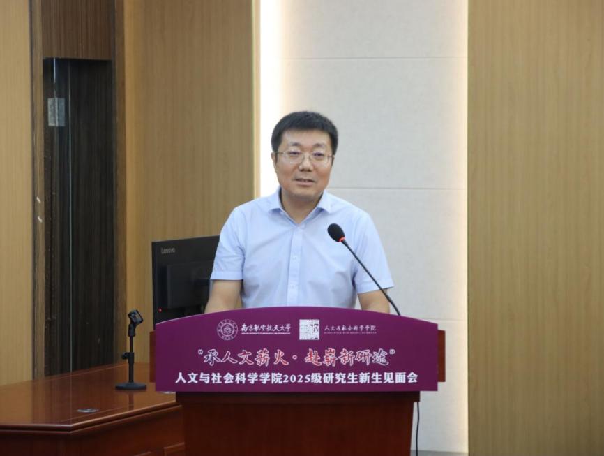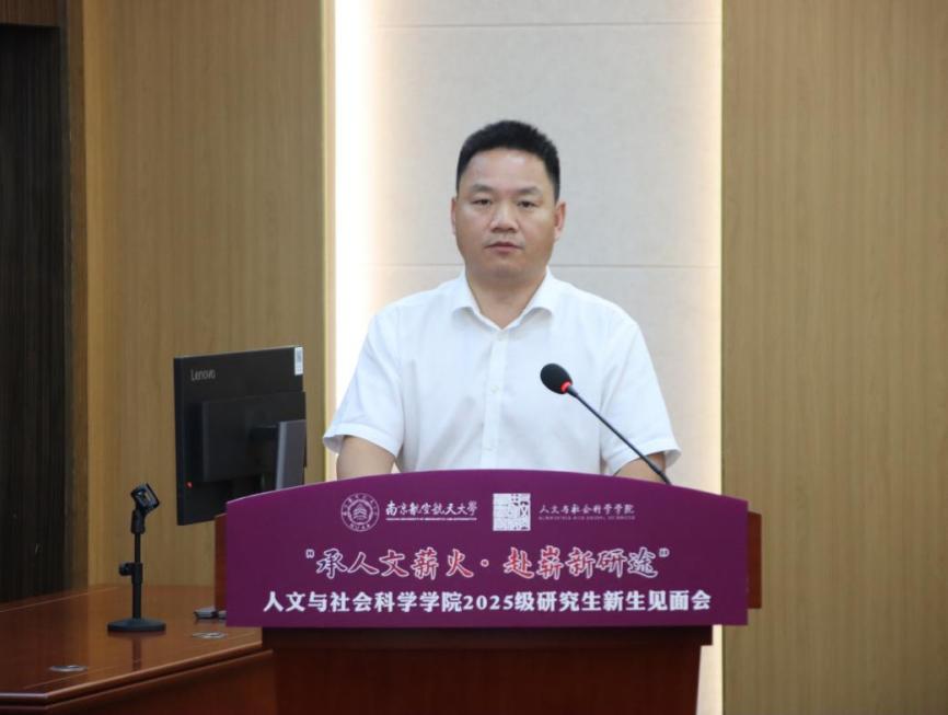 我院院长高志宏代表全院师生向2025级研究生新同学表达了热烈欢迎和诚挚祝贺。他围绕“爱校、爱院、爱己”三个关键词,通过勉励大家“以学校为荣,从南航的四次跨越中读懂使命担当”“以学院为家,在人文沃土中汲取成长力量”“以修己为基,在积极向上中书写精彩人生”,与同学们探讨了在未来的学习生活中,应该如何在南航人文这片沃土上找准定位、实现价值。