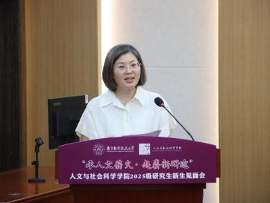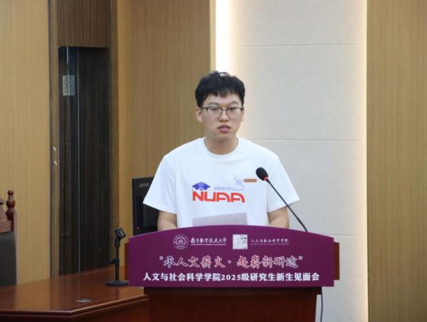 研工部副部长雷蕾向各位新同学的到来表示热烈欢迎。她强调,研究生阶段是知识深化、能力提升、思维碰撞的黄金时期,希望同学们能正确认识导学关系、同辈关系、小我与大我的关系,在青春奉献中彰显人生价值。她祝愿2025级新同学们在南航、在人文学院能不忘初心、坚守理想、收获成长。